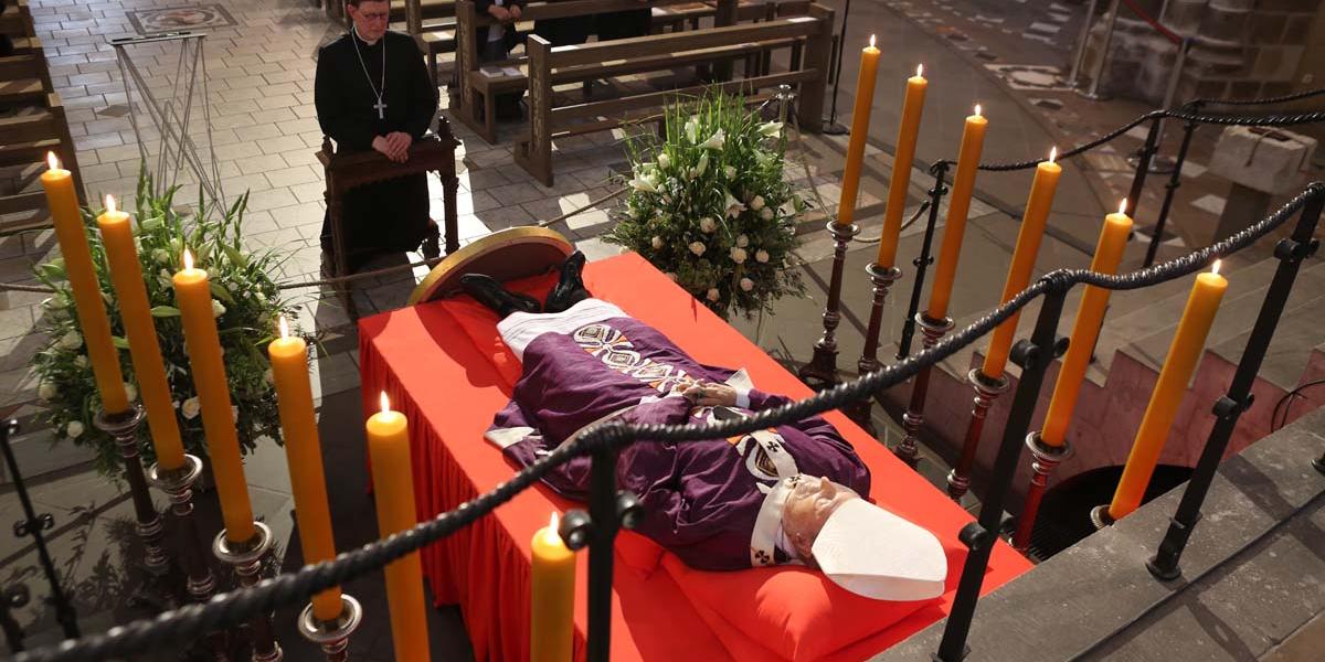 Von heute Abend bis einschließlich Montag haben Gläubige in St. Gereon die Möglichkeit, sich von ihrem Alt-Erzbischof zu verabschieden. Dazu ist der Verstorbene auf einem Katafalk aufgebahrt. Der verstorbene Kardinal Meisner trägt ein violettes Messgewand, das Pallium und eine weiße Mitra. Das Gewand war sein Lieblingsgewand, das ihm zur Priesterweihe geschenkt worden war. Daher ist das über 50-Jahre-alte Gewand oft getragen worden und an manchen Stellen ausgebessert. Violett ist in der katholischen Kirche die liturische Farbe der Buße und der Trauer.