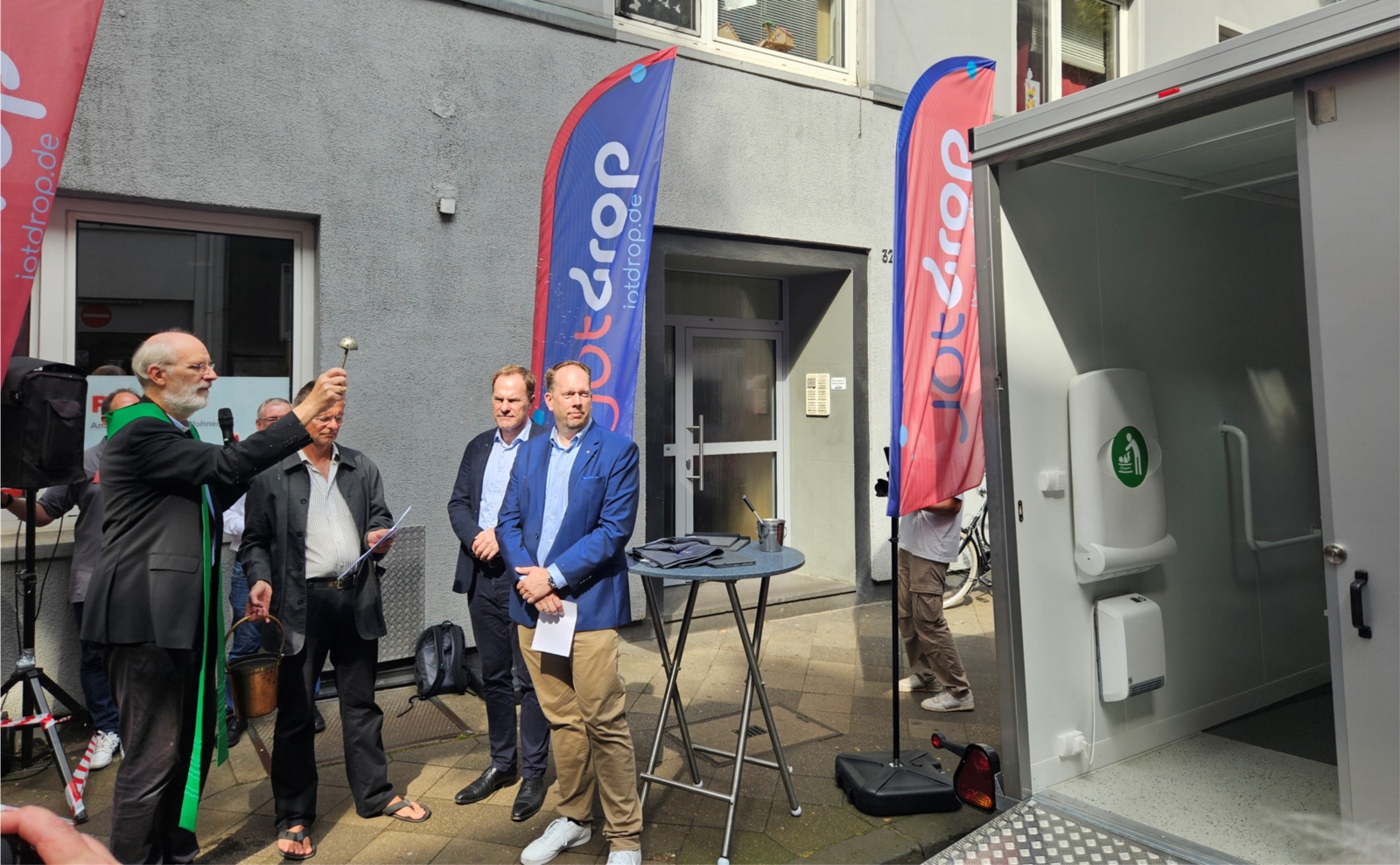 Oberbürgermeister Dr. Stephan Keller freute sich, dass mit jotdrop die vorhandenen Hilfsangebote in der Stadt „nicht nur ergänzt, sondern auch erweitert werden. Es ist ein wichtiges Projekt, das den Menschen ihre Würde zurückgibt.“ Zum Abschluss segnete Weihbischof Ansgar Puff das Duschmobil und erinnerte daran, dass eine Dusche für manche Menschen, die „Monate keine Dusche zur Verfügung hatten, tatsächlich Luxus ist“.