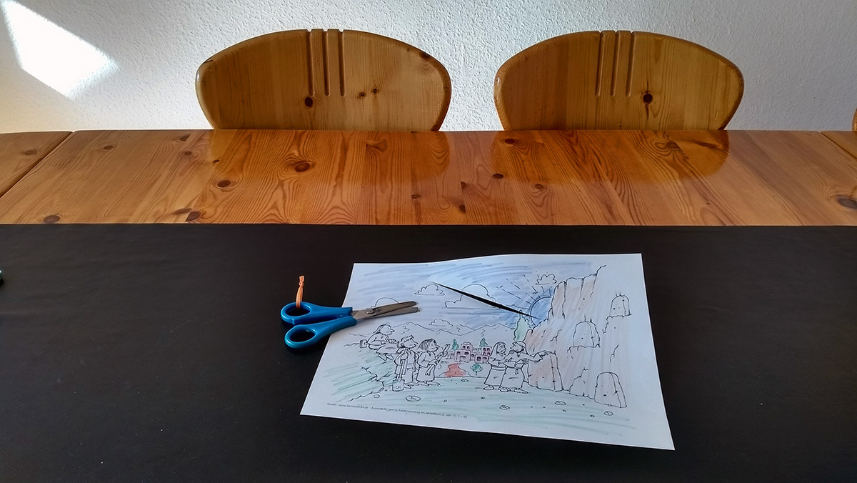 Das Bibelbild bunt ausmalen. Dabei die Sonne nicht gelb ausmalen, sondern die Hintergrundfarben darüber malen.