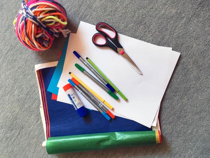 Nehmt dann das weiße Papier und malt es bunt an. Das wird dann euer Pusterohr.